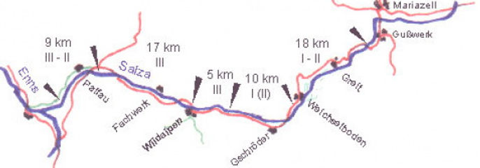 A Salza folyó völgye Steiermark tartomány északi részén helyezkedik el. A folyó mintegy 82 km hosszú, azonban kb. 35-40 km hosszan evezhető évszaktól és vízállástól függően. A vadvízi evezésre legalkalmasabb a május és október közötti időszak. A tartományi szabályzás alapján 3 személyesnél nagyobb rafting hajóval csak május 1 és október 15 között hajózható. Három személyesnél kisebb hajók (kenuk és kajakok) használata nincsen szabályozva. Cégünk a középső Wechelsboden – Wildalpen - Palfau szakaszára szervez rafting túrákat. Magas vízállásnál (wildalpnai vízmérce szerint 200 - 250 cm) a felső szakasza is evezhető, de ilyenkor, az alsó-középső szakasza (Fachwerk alatt) nem javasolt evezésre 2-3 személyes hajókkal. A folyó erőssége a White Water I-VI. skálán WW II-III+ közötti, tehát közepes nehézségűnek mondható. Nincsenek benne elzárt zúgók, a legtöbb részén az egész folyóvölgy jól belátható és az akadályok könnyen észlelhetők. Átlagos lejtése 4-7 ‰, ami azt jelenti, hogy 1000 méterenként a folyó 4-7 métert esik. Összehasonlításképpen a Duna 417 km hosszú Magyarországi szakaszának esése 27 m.